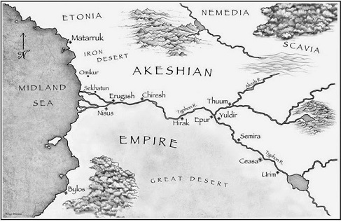 The two series occur in the same world, but in different regions. Horace’s home country of Arnos, for instance, is the eastern neighbor of Nimea, where Caim gets his start in Shadow’s Son. The Akeshian Empire is quite a bit east of them both.