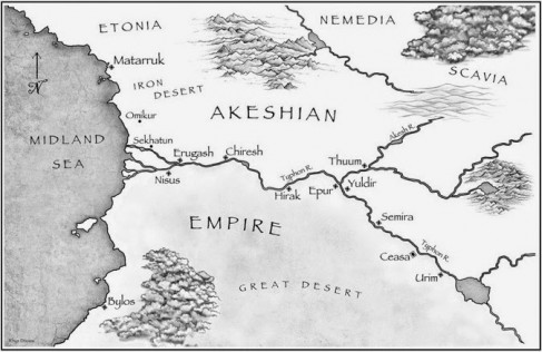 Description extends into geography, which in turn affects the story. Beyond the fertile valley of the Typhon River, Akeshia is flanked by large deserts. These natural boundaries protect the empire from foreign enemies, but also insulate the empire from the rest of the world, resulting in a stagnant society.